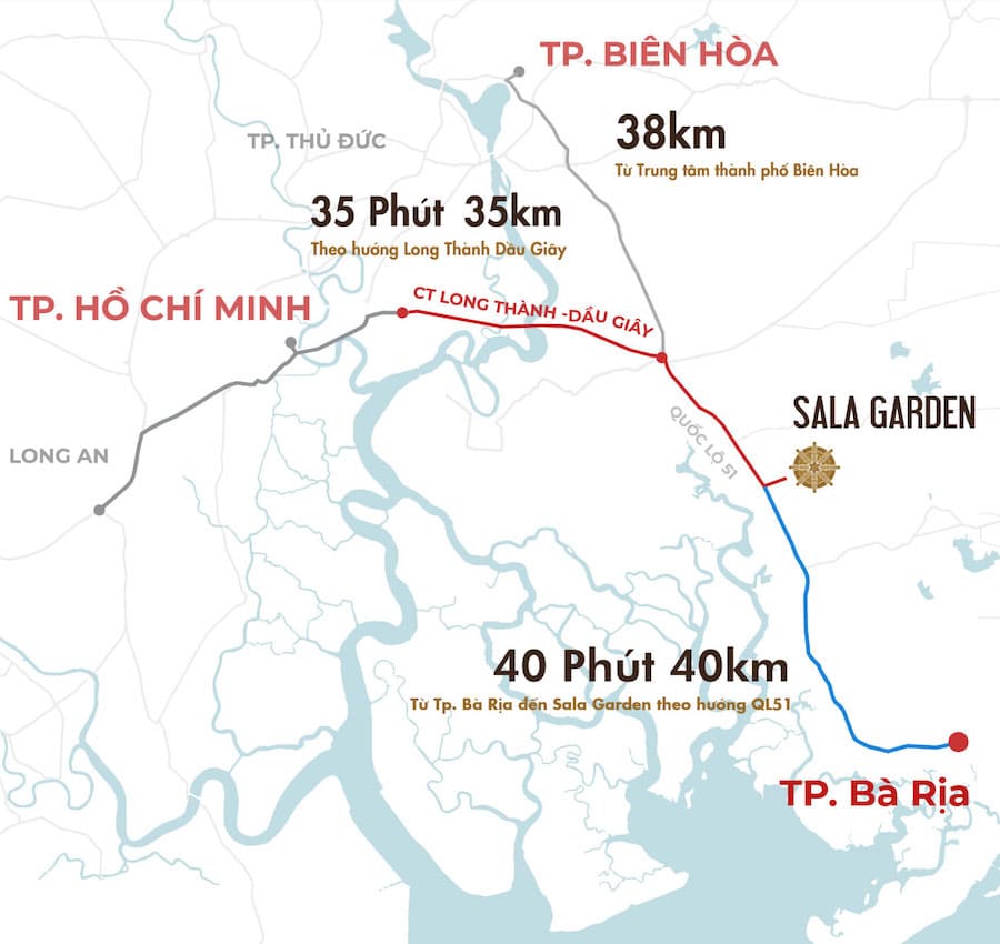 Sala Garden chỉ cách trung tâm TP. Hồ Chí Minh 35 phút lái xe, và 10 phút đến sân bay Long Thành . Vị trí này là nút giao thoa của các thành phố lớn, thuận tiện cho việc di chuyển đến các tuyến đường giao thông huyết mạch.